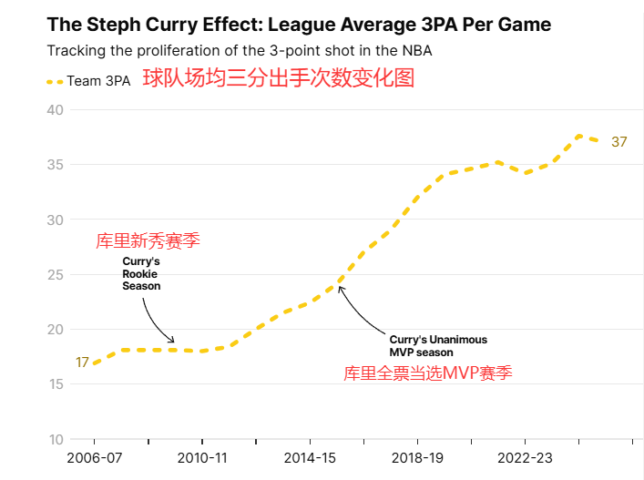 库里用他的三分能力和敢投敢出手的球风彻底革新了篮球运动。他刚进联盟时,篮球还是以内线为主,三分大多只是进攻时间所剩无几时的无奈选择,而非致命武器。如今,整个联盟都在模仿库里的风格——三分,以及三分背后的数学逻辑。